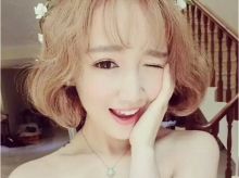焦糖棕的发色,很自然清新哦!bobo头的短发设计,与玉米烫的发型设计相结合,甜美小公主就这样打造出来的哦!夹一个蝴蝶结头饰,再穿上一款仙仙的糖果色雪纺衫,楚楚动人的小美人一个哦!