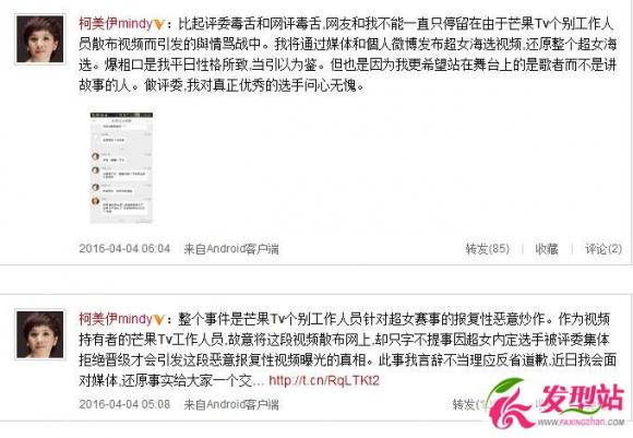 4月4日05:08,柯以敏发微博将整个事件定性为“芒果TV个别工作人员针对超女赛事的报复性恶意炒作”,并将该条微博设置为置顶。柯以敏称,作为视频持有者的芒果TV工作人员,故意将这段视频散布网上,而这段视频之所以会曝光,是因为超女内定选手被评委集体拒绝晋级。
