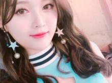 超青春可爱的一款韩式马尾,令乔妹看起来嫩嫩哒!空气刘海搭配高扎的马尾卷发,不仅巧妙的修颜,而且凸显出她青春靓丽的一面,非常美腻。