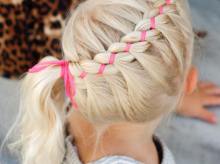 马尾发可是司空见惯的扎发发型,但是先将头上的发丝先做横向麻花辫编发,再将麻花辫发丝的一股股发丝独留扎成马尾非常前卫。相信这款发型小公举肯定会很喜欢。