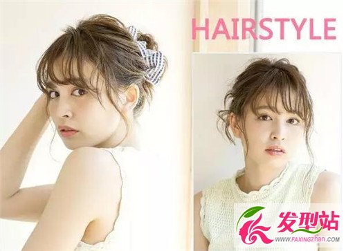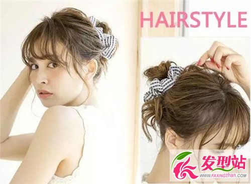 步骤:刘海两边调两小束发丝出来,剩余的头发全部集中到后脑勺,扎成凌乱小发髻。再用发圈遮盖扎发橡皮筋,然后稍微用手拉扯一下头顶的发丝。