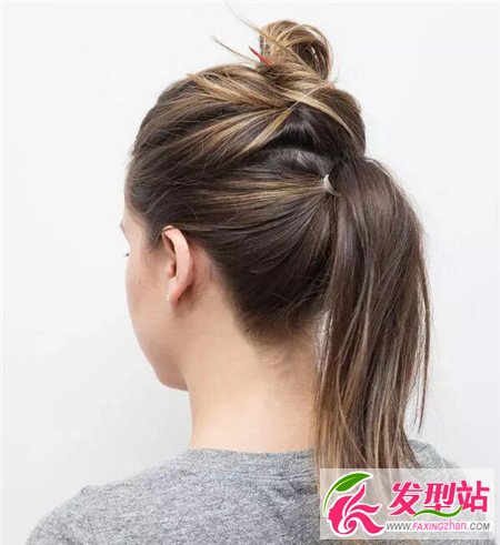 也可以先把头发扎起一半,用皮筋绑起,再扎头顶的另一半,最后两部分结合绑定,比简单地扎一个马尾辫效果好很多。