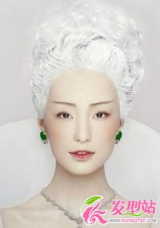 纯白色的发髻,高高的束在脑后做蓬松的大卷,前额上没有一丝多余的修饰,凸显了精致的五官,在加上以白色为主色调的妆容,烘托出了童话奇境中精灵的高贵纯洁形象。