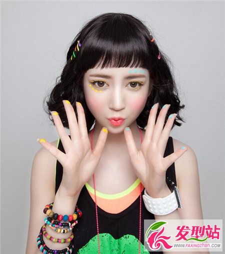 萌妹纸都大爱亮片妆,这款平直薄刘海搭配上齐肩微扣的短卷发,搭配上几个一毛钱的彩色发卡,就很有可爱感。
