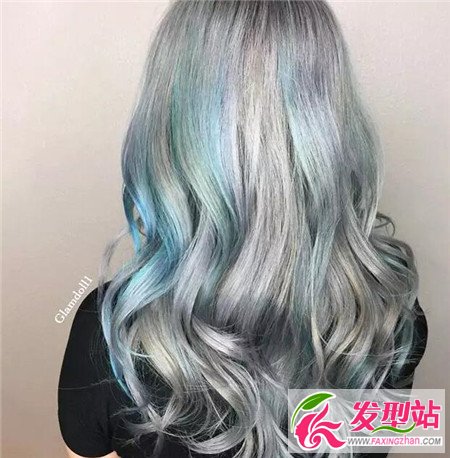 金属质感的发型,大波浪卷发上,从不同角度,看到的是不同的染发色彩,银灰、紫、蓝、绿等,在阳光下又是一种,这金属的发色制造出渐层染效果。