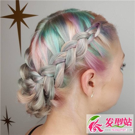 糖果色加入彩虹色质感染发设计,弥漫浪漫,花型刘海编发+圆筒的盘发设计,唯美简单,自然简约。