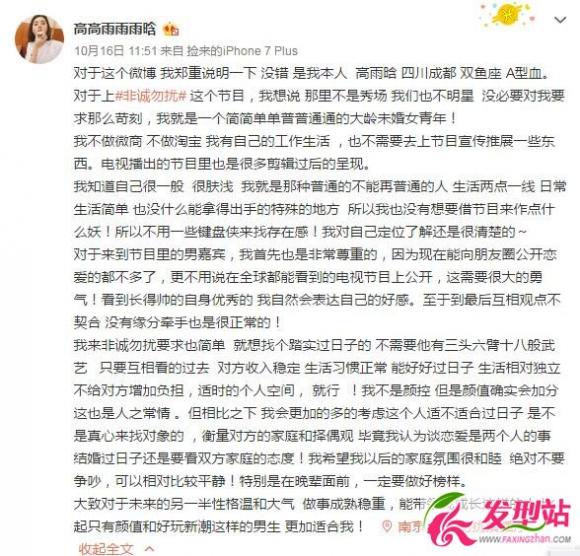 高雨晗微博申明全文: