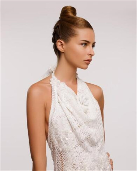 近看这款圆筒盘发,是采用倒编的发型设计,头发都盘出圆弧饱满的样子。