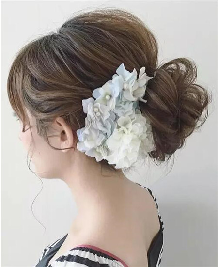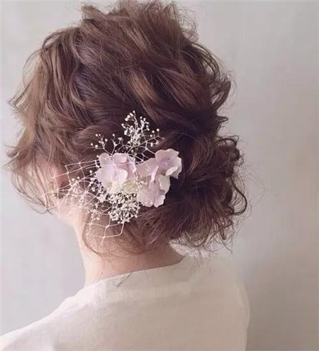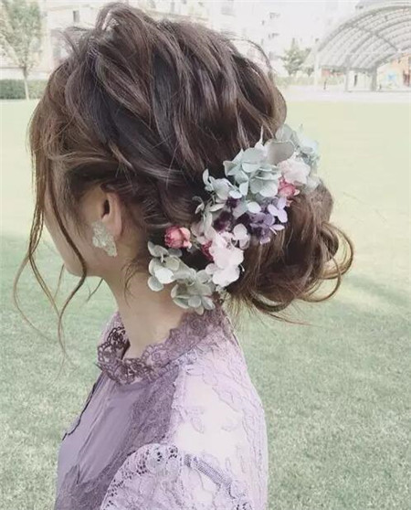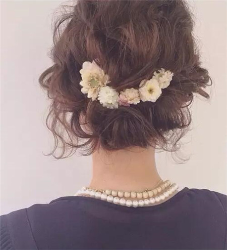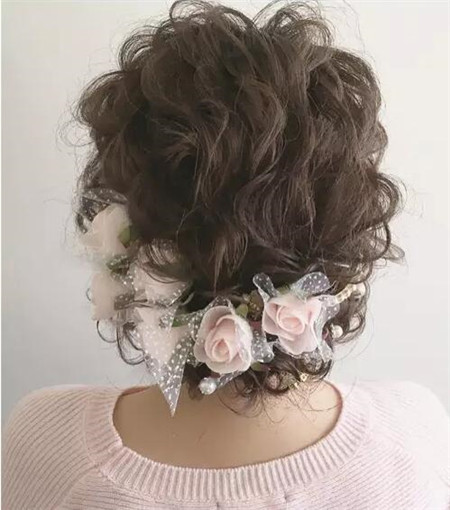 粉色鲜花造型,修饰了凌乱感发型带来的蓬松空气风,杂乱的盘发也不至于那么凌乱不堪。