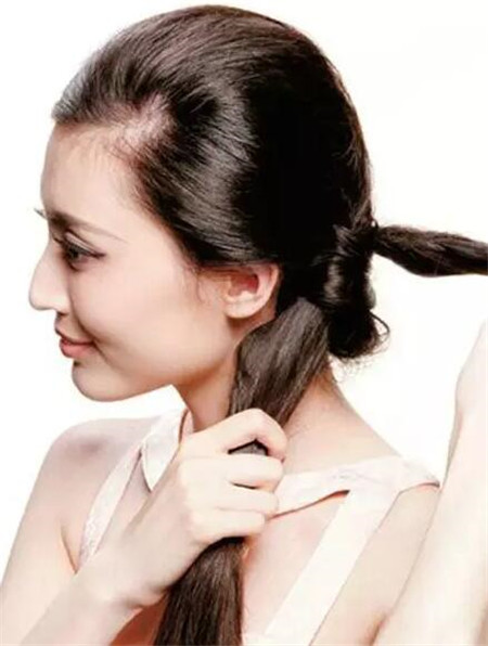 头发打结打紧之后,将发量少的那份马尾找出,将它和另一个马尾打结。