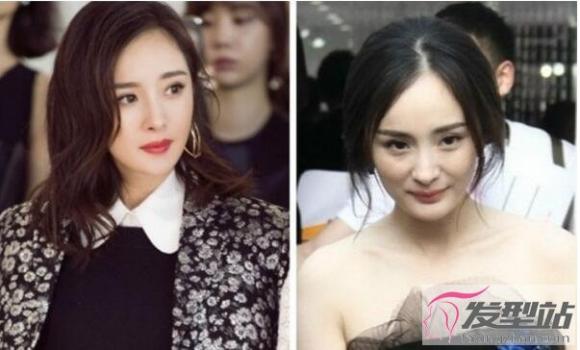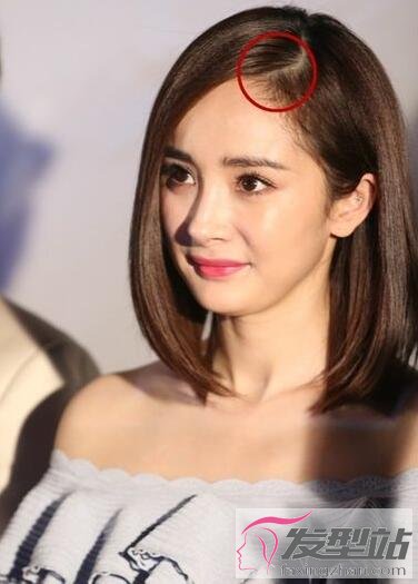 杨幂脸型额头饱满,而且下巴略短,所以4:6 比例的头发分界最为合适。