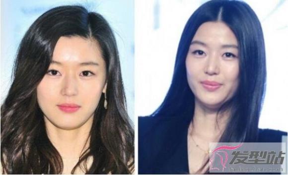 看看全智贤,简单将头发分界分别侧分和中分,外型上的分别也是显而易见。