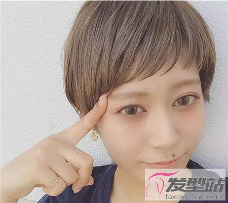 因为脸较方,所以注重方的修饰。狗啃刘海超短发设计,拉长脸型,打造甜美感。