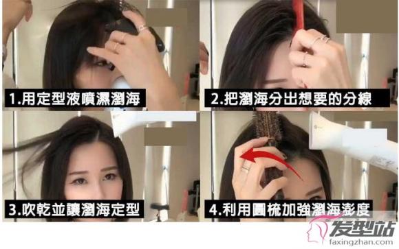 因为短刘海要旁分的话,基本上是非常容易掉回额头位置的,因此这时候我们可以利用一些固定发丝的发品(例如:定型喷雾)将刘海喷湿,接着拿出梳子划分出大旁分刘海的分线,然后再使用吹风机和圆梳帮助刘海定型,吹整出立体又蓬松的高角弧度!
