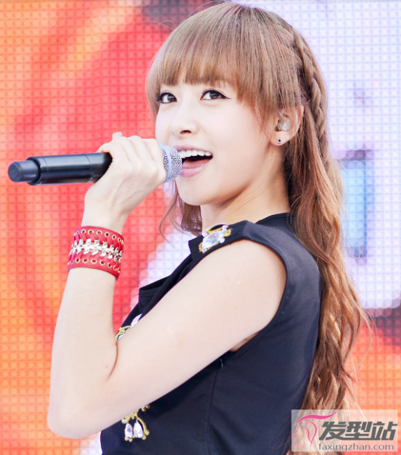 宋茜在团队里是不折不扣的舞蹈担当,今年来也跻身时尚的潮流了。这款舞蹈发型,霸气侧漏,又透露着少女的小可爱气息。编发的设计十分巧妙。波浪卷发显得温柔妩媚,红橘色的染发,衬托了宋茜的肤色非常红润,将舞台女王的魅力展现得淋漓尽致。