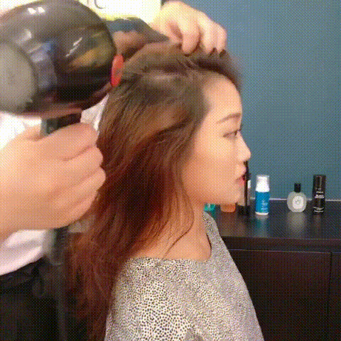 想要绑出漂亮有质感的韩系花苞头,头发的蓬松感也非常重要,如果没有海量的发量,老师建议我们可以先在家将头发用梳子梳松后,用吹风机朝发根处逆吹,让头顶更加蓬松!(如果头发还是很塌,可以在梳头发前喷一点蓬蓬粉再吹,效果更佳!)