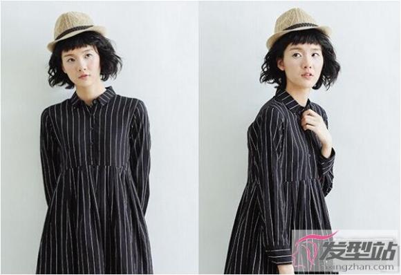 非常独特、散发出个性魅力的一款梨花头,刘海比较整齐,颇有二次元刘海的感觉。烫成梨花头后发尾带有凌乱的微卷,带上复古帽子很有日系风格。