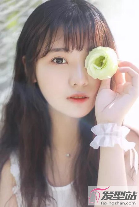 长直发是款最基本的发型,甜美的空气齐刘海的搭配,自然的发色,使她有种娴静素雅的气质。