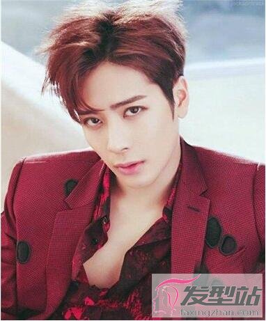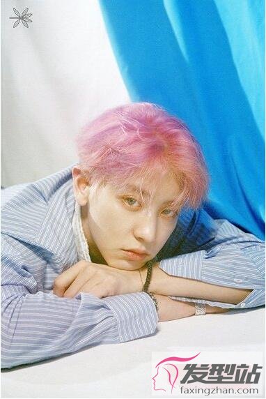 男生的一头短发很是飘逸,而且修剪出层层叠叠的效果,染成樱花粉色后更是潮,几缕碎发丝垂在额前,穿上酒红色西装更是比女生还精致。