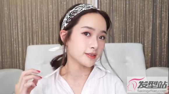 14. 发带mix小卷低马尾:先绑好低马尾之后,拉出两侧鬓角发,把丝巾折成长条状绑于马尾下方