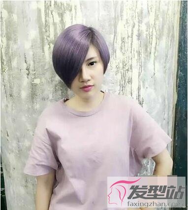 拥有柔软发质的女生,比较容易凹造型,将头发修剪成左右两侧不对称的样式,发量形成鲜明对比,一侧头发几乎覆盖住半边脸颊,染成紫色更加与众不同。