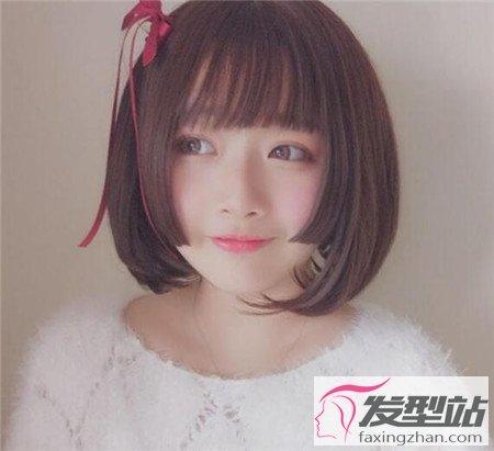 这是一款经典的姬发式短发。头发沿着脸型修剪,呈现出优美的弧线形,打造出内扣的效果,修颜效果满分,女生有些圆润的脸颊顿时尖俏了不少,轻薄的刘海特别俏皮,戴上深红色蝴蝶结发带很甜美。