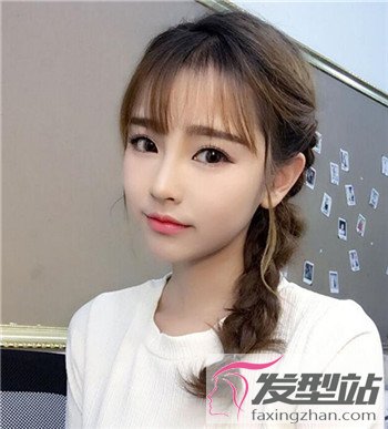 中长发侧扎成麻花辫,造型随性凌乱,轻薄的刘海倍显温柔。