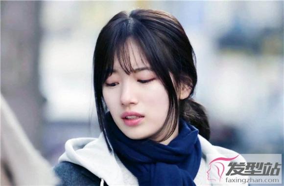 比较简约自然的一款扎发,也充满了时尚感,空气刘海轻薄稀疏,搭配利落大方的低扎发,给人温柔可人楚楚可怜的感觉。
