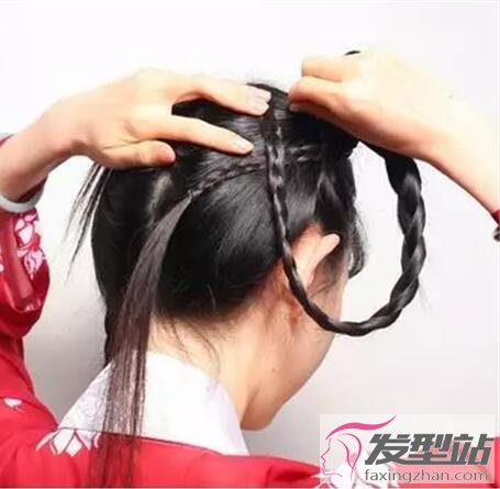 步骤3:将左侧头发中其中一条辫子向上盘起。