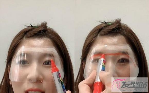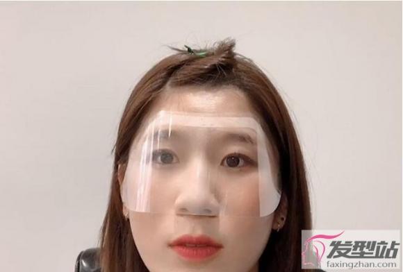 接着就是用麦克笔直接在塑胶片上画出理想的刘海长度以及款式,将塑胶片变成刘海的量尺,因为塑胶片是透明的,所以可以根据眉毛、眼睛等部位来画出线条!