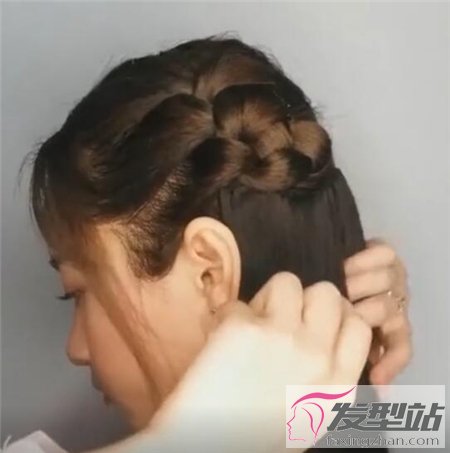 步骤8:取出假发发髻,使其覆盖住原有的短发扎发。再将步骤7中取出的假发片按照如图所示的方法,盘成环形发髻。