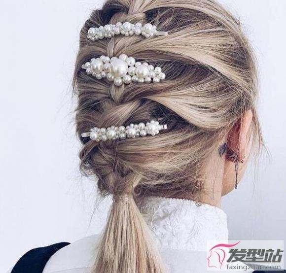 擅长做鱼骨辫的女生们,可以参考这种做法。将三个阿婆发夹分段式夹在鱼骨辫上,会令层次感更加突出,更有淑女气质。