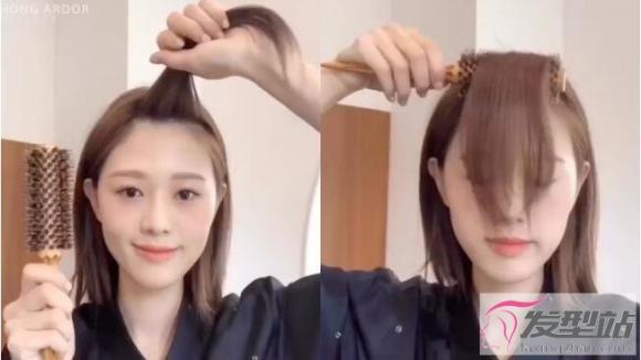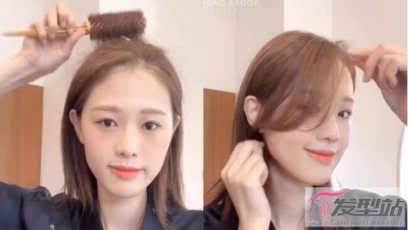 最后一步圆梳一样固定在刘海上,拿起吹风机吹整刘海后,数3秒再将圆梳放下~