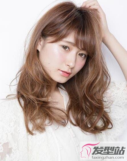 女生齐刘海长卷发,搭配亚麻色发色减龄显白,头发烫出大波浪卷更可爱,女性魅力尽显,是一款很经典的女生卷发发型。