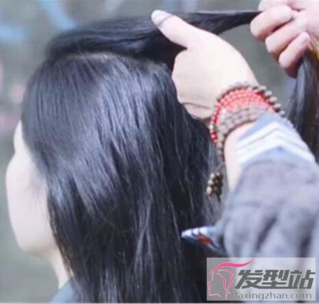 步骤4:从辫子旁边取若干头发,用准备好的编发器,让麻花辫从中穿过。方法就是按左右两边的顺序依次穿过。