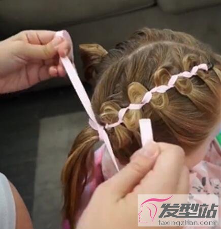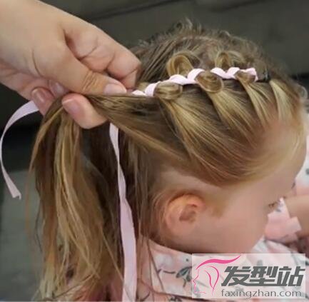 步骤2:在步骤1的基础上开始编织细细的发辫,用丝带穿插其中作为点缀,正好代替了橡皮筋的功能。