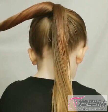 步骤2:从步骤1中分好的右边部分头发中,取出一小缕发丝,将其环绕过余下的发丝,再系个结。