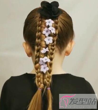 步骤5:最后用准备好的小花朵发饰、蝴蝶结发饰点缀其间,这款甜美编发发型就完成了,是不是非常简单又很有特色呢?妈妈们学会了就赶紧为女儿扎上同款编发吧。