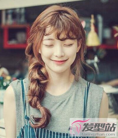 同样是一款适合额头宽女生的发型,刘海烫出一定的卷度,女生的发量繁多,编织成发辫搭配脸侧的碎发丝,额头变得完美。