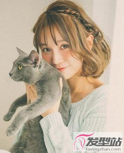 这款短发同样是额头宽女生可以尝试的,顶部头发是顺直的梳理,发尾烫出蓬松的效果,轻薄的刘海搭配编发,甜美动人。