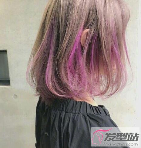 短发发尾一刀切,加个外翘的设计,紫罗兰的发色非常梦幻,粉色和灰色的点缀,吸睛力百分百。