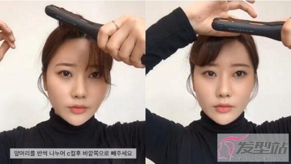 接着将刘海分为左、右两边,分别向外夹出一个弧度即可,这边要注意的是,刚刚夹过的发根处就不用再碰到离子夹了、只夹刘海下面就好,不然会破坏刚刚夹的发根!