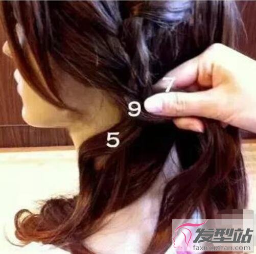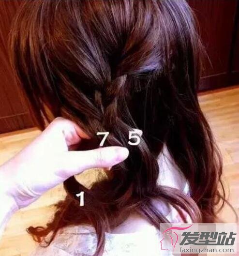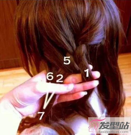 步骤3:先用编织三股辫的方法,3放在2上面,1放在3上面。在3的旁边取出一部分头发,发量不要超过3号的发量,并且标志为4,把3和4合拢形成5。