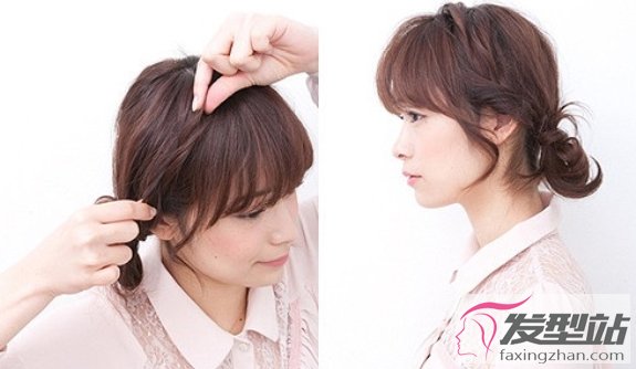 第六步:多余的发尾沿着皮筋缠绕,遮住橡皮筋
