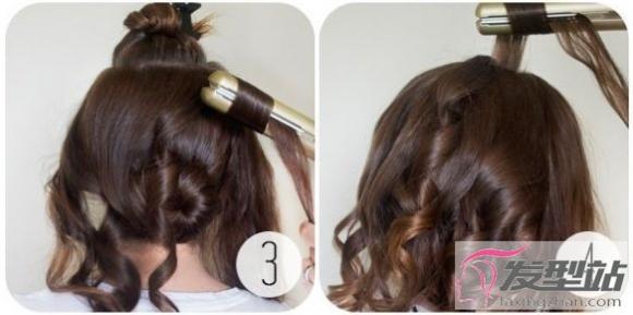 第三步:上半部分的头发用卷发棒分层烫卷