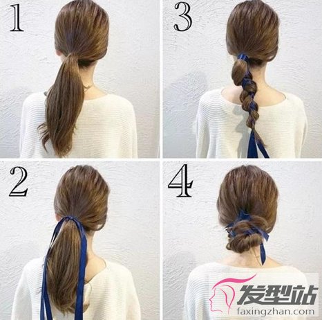 2:将丝带与马尾编至一个紧致的三股辫,最后盘起,稍加调整蓬松就完成了!