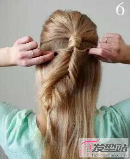 步骤5:开始编织鱼骨辫。鱼骨辫的编法即用食指挑出最外边的头发,用另一右手的食指将其拨到另一边。同样另一半也是用手指挑最外面的头发,转移到左边,另一只手抓去合并,编完鱼骨辫后用橡皮筋固定。