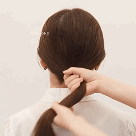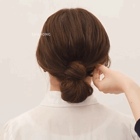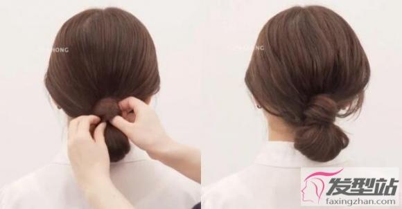 STEP3:将剩余的头发顺时钟绕在发圈上,遮盖着发圈,再将最后的发尾收缠绕的头发中。