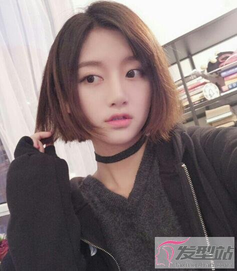 同样是适合圆脸女生的短发,头发顺着头型修剪,呈现出自然的弧线形,刘海加上发夹,青春靓丽。