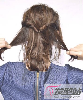 第三步:然后将这两个拧转发束扎在一起